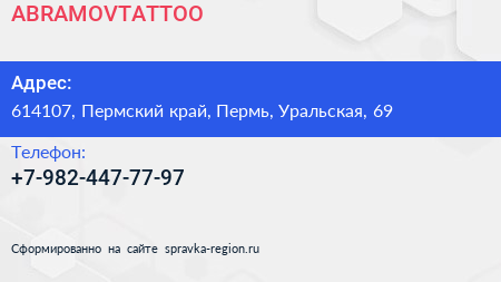 ABRAMOVTATTOO по адресу 614107, Пермский край, Пермь, Уральская, 69 в дальнейшем Организация, размещена в следующих категориях: