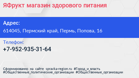 ЯФрукт, магазин здорового питания по адресу 614045, Пермский край, Пермь, Попова, 16 в дальнейшем Организация, размещена в следующих категориях:
