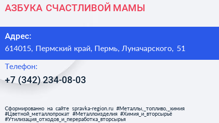 АЗБУКА СЧАСТЛИВОЙ МАМЫ по адресу 614015, Пермский край, Пермь, Луначарского, 51 в дальнейшем Организация, размещена в следующих категориях: