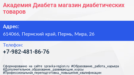 Академия Диабета, магазин диабетических товаров по адресу 614066, Пермский край, Пермь, Мира, 26 в дальнейшем Организация, размещена в следующих категориях: