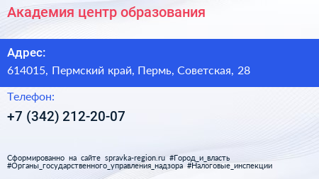 Академия, центр образования по адресу 614015, Пермский край, Пермь, Советская, 28 в дальнейшем Организация, размещена в следующих категориях: