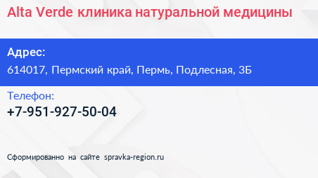 Alta Verde, клиника натуральной медицины по адресу 614017, Пермский край, Пермь, Подлесная, 3Б в дальнейшем Организация, размещена в следующих категориях: