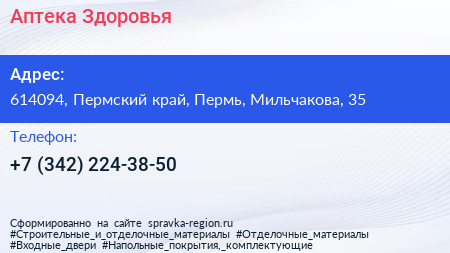 Аптека Здоровья по адресу 614094, Пермский край, Пермь, Мильчакова, 35 в дальнейшем Организация, размещена в следующих категориях: