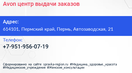Avon, центр выдачи заказов по адресу 614101, Пермский край, Пермь, Автозаводская, 21 в дальнейшем Организация, размещена в следующих категориях:
