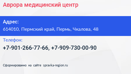 Аврора, медицинский центр по адресу 614010, Пермский край, Пермь, Чкалова, 48 в дальнейшем Организация, размещена в следующих категориях: