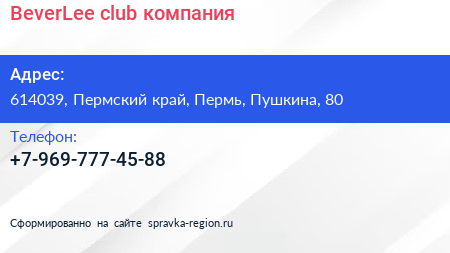 BeverLee club, компания по адресу 614039, Пермский край, Пермь, Пушкина, 80 в дальнейшем Организация, размещена в следующих категориях: