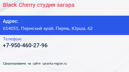 Black Cherry, студия загара по адресу 614051, Пермский край, Пермь, Юрша, 62 в дальнейшем Организация, размещена в следующих категориях: