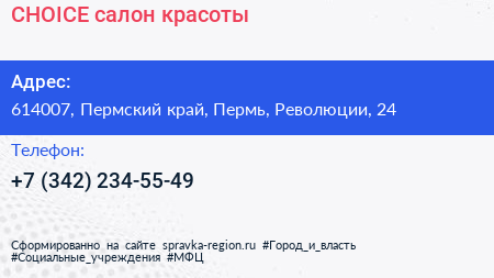 CHOICE, салон красоты по адресу 614007, Пермский край, Пермь, Революции, 24 в дальнейшем Организация, размещена в следующих категориях: