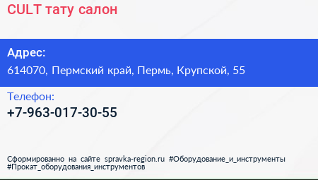 CULT, тату-салон по адресу 614070, Пермский край, Пермь, Крупской, 55 в дальнейшем Организация, размещена в следующих категориях: