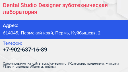 Dental Studio Designer, зуботехническая лаборатория по адресу 614045, Пермский край, Пермь, Куйбышева, 2 в дальнейшем Организация, размещена в следующих категориях: