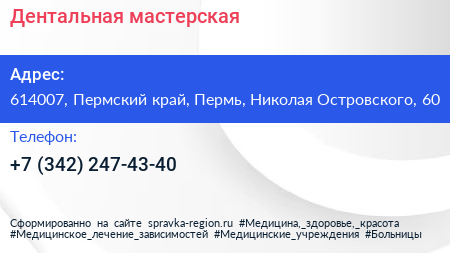 Дентальная мастерская по адресу 614007, Пермский край, Пермь, Николая Островского, 60 в дальнейшем Организация, размещена в следующих категориях: