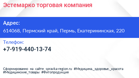 Эстемарко, торговая компания по адресу 614068, Пермский край, Пермь, Екатерининская, 220 в дальнейшем Организация, размещена в следующих категориях: