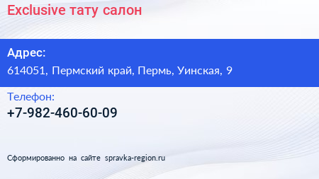 Exclusive, тату-салон по адресу 614051, Пермский край, Пермь, Уинская, 9 в дальнейшем Организация, размещена в следующих категориях: