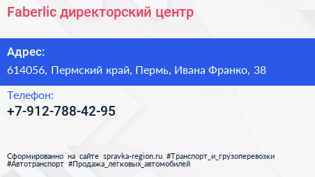 Faberlic, директорский центр по адресу 614056, Пермский край, Пермь, Ивана Франко, 38 в дальнейшем Организация, размещена в следующих категориях: