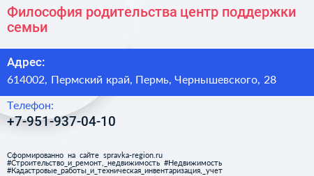 Философия родительства, центр поддержки семьи по адресу 614002, Пермский край, Пермь, Чернышевского, 28 в дальнейшем Организация, размещена в следующих категориях: