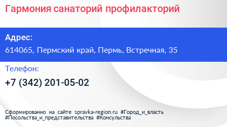Гармония, санаторий-профилакторий по адресу 614065, Пермский край, Пермь, Встречная, 35 в дальнейшем Организация, размещена в следующих категориях: