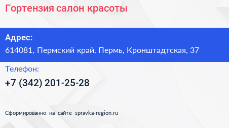 Гортензия, салон красоты по адресу 614081, Пермский край, Пермь, Кронштадтская, 37 в дальнейшем Организация, размещена в следующих категориях: