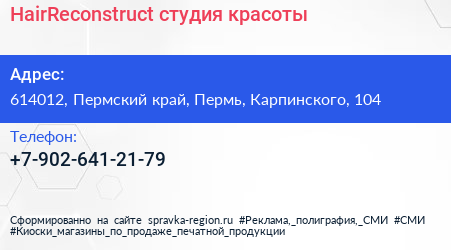 HairReconstruct, студия красоты по адресу 614012, Пермский край, Пермь, Карпинского, 104 в дальнейшем Организация, размещена в следующих категориях: