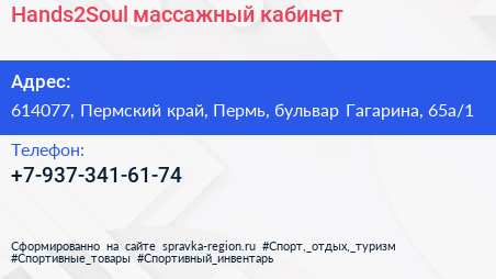 Hands2Soul, массажный кабинет по адресу 614077, Пермский край, Пермь, бульвар Гагарина, 65а/1 в дальнейшем Организация, размещена в следующих категориях: