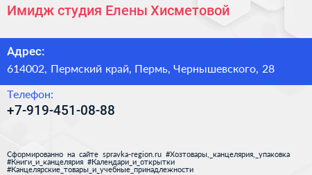 Имидж-студия Елены Хисметовой по адресу 614002, Пермский край, Пермь, Чернышевского, 28 в дальнейшем Организация, размещена в следующих категориях: