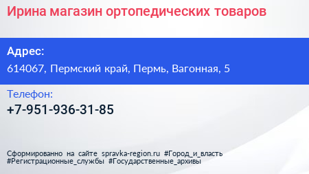 Ирина, магазин ортопедических товаров по адресу 614067, Пермский край, Пермь, Вагонная, 5 в дальнейшем Организация, размещена в следующих категориях: