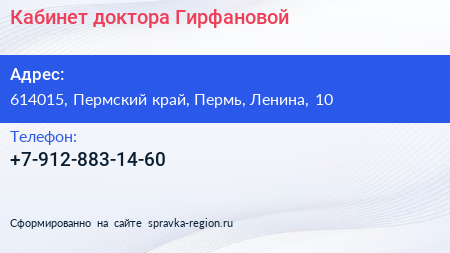 Кабинет доктора Гирфановой по адресу 614015, Пермский край, Пермь, Ленина, 10 в дальнейшем Организация, размещена в следующих категориях: