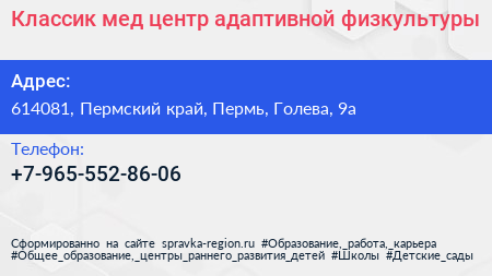 Классик мед, центр адаптивной физкультуры по адресу 614081, Пермский край, Пермь, Голева, 9а в дальнейшем Организация, размещена в следующих категориях:
