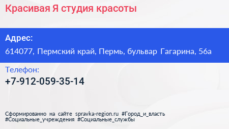 Красивая Я, студия красоты по адресу 614077, Пермский край, Пермь, бульвар Гагарина, 56а в дальнейшем Организация, размещена в следующих категориях: