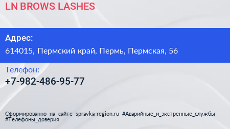 LN BROWS & LASHES по адресу 614015, Пермский край, Пермь, Пермская, 56 в дальнейшем Организация, размещена в следующих категориях: