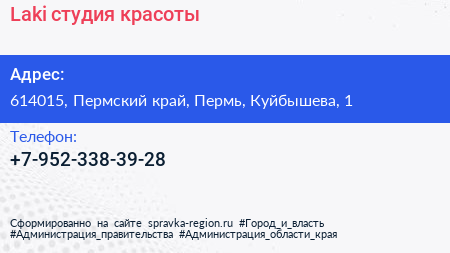Laki, студия красоты по адресу 614015, Пермский край, Пермь, Куйбышева, 1 в дальнейшем Организация, размещена в следующих категориях: