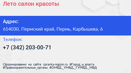 Лето, салон красоты по адресу 614030, Пермский край, Пермь, Карбышева, 6 в дальнейшем Организация, размещена в следующих категориях: