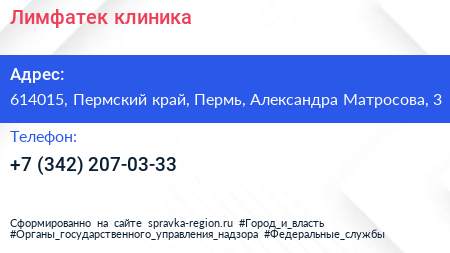 Лимфатек, клиника по адресу 614015, Пермский край, Пермь, Александра Матросова, 3 в дальнейшем Организация, размещена в следующих категориях: