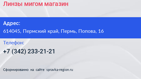 Линзы мигом, магазин по адресу 614045, Пермский край, Пермь, Попова, 16 в дальнейшем Организация, размещена в следующих категориях: