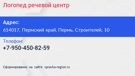 Логопед, речевой центр по адресу 614017, Пермский край, Пермь, Строителей, 10 в дальнейшем Организация, размещена в следующих категориях: