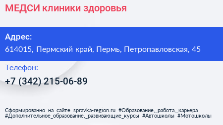 МЕДСИ, клиники здоровья по адресу 614015, Пермский край, Пермь, Петропавловская, 45 в дальнейшем Организация, размещена в следующих категориях:
