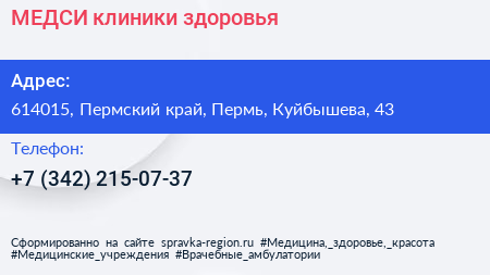 МЕДСИ, клиники здоровья по адресу 614015, Пермский край, Пермь, Куйбышева, 43 в дальнейшем Организация, размещена в следующих категориях: