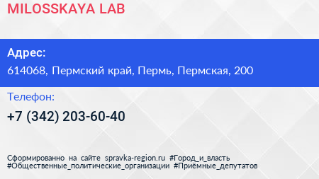 MILOSSKAYA.LAB по адресу 614068, Пермский край, Пермь, Пермская, 200 в дальнейшем Организация, размещена в следующих категориях: