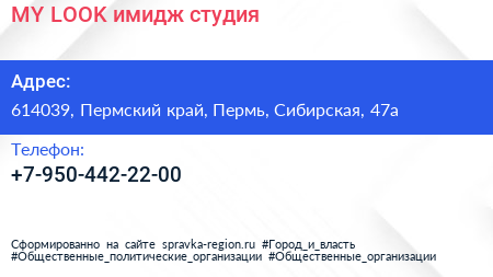 MY LOOK, имидж-студия по адресу 614039, Пермский край, Пермь, Сибирская, 47а в дальнейшем Организация, размещена в следующих категориях: