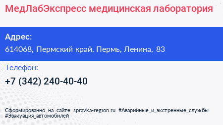 МедЛабЭкспресс, медицинская лаборатория по адресу 614068, Пермский край, Пермь, Ленина, 83 в дальнейшем Организация, размещена в следующих категориях: