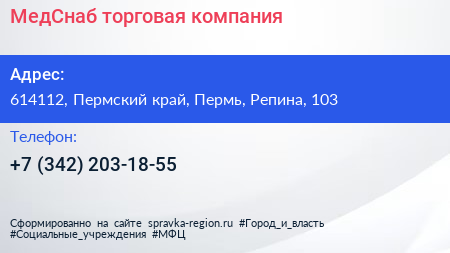 МедСнаб, торговая компания по адресу 614112, Пермский край, Пермь, Репина, 103 в дальнейшем Организация, размещена в следующих категориях: