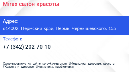 Mirax, салон красоты по адресу 614002, Пермский край, Пермь, Чернышевского, 15а в дальнейшем Организация, размещена в следующих категориях: