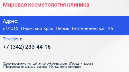 Мировая косметология, клиника по адресу 614015, Пермский край, Пермь, Екатерининская, 96 в дальнейшем Организация, размещена в следующих категориях: