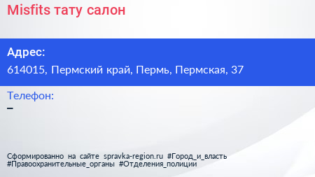 Misfits, тату-салон по адресу 614015, Пермский край, Пермь, Пермская, 37 в дальнейшем Организация, размещена в следующих категориях: