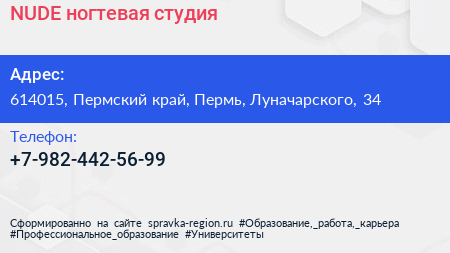 NUDE, ногтевая студия по адресу 614015, Пермский край, Пермь, Луначарского, 34 в дальнейшем Организация, размещена в следующих категориях: