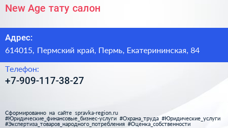 New Age, тату-салон по адресу 614015, Пермский край, Пермь, Екатерининская, 84 в дальнейшем Организация, размещена в следующих категориях:
