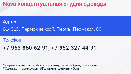 Nova, концептуальная студия одежды по адресу 614015, Пермский край, Пермь, Пермская, 80 в дальнейшем Организация, размещена в следующих категориях: