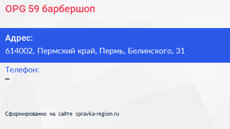 OPG 59, барбершоп по адресу 614002, Пермский край, Пермь, Белинского, 31 в дальнейшем Организация, размещена в следующих категориях: