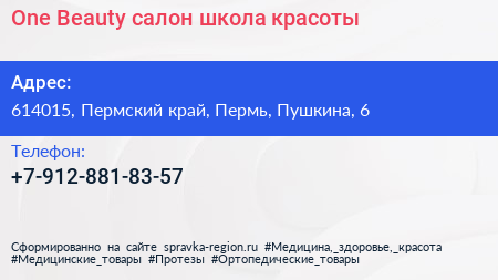 One Beauty, салон-школа красоты по адресу 614015, Пермский край, Пермь, Пушкина, 6 в дальнейшем Организация, размещена в следующих категориях: