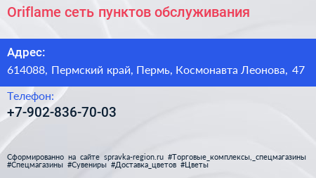 Oriflame, сеть пунктов обслуживания по адресу 614088, Пермский край, Пермь, Космонавта Леонова, 47 в дальнейшем Организация, размещена в следующих категориях: