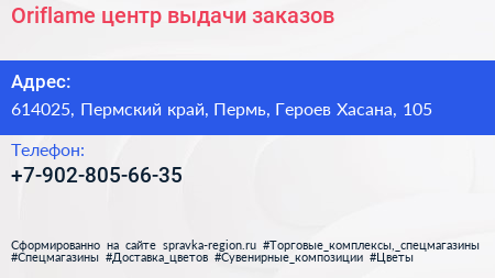 Oriflame, центр выдачи заказов по адресу 614025, Пермский край, Пермь, Героев Хасана, 105 в дальнейшем Организация, размещена в следующих категориях: